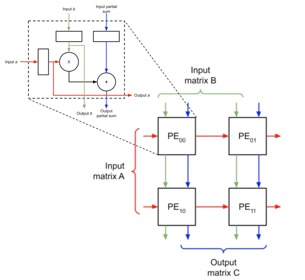 Figure 7. Diagram of a systolic array for MAC operations. Original image adapted from two images in this blog post.
