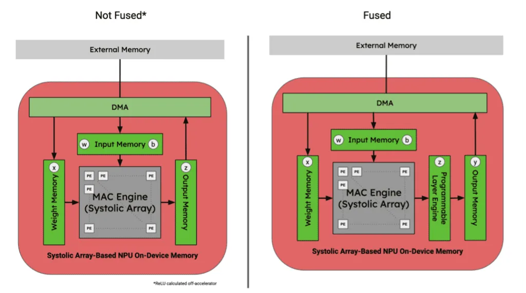 The most performant NPU’s are designed with operator fusion in mind for a limited set of permutations of operators. Since they are hard-wired and therefore cannot be programmed, they cannot handle memory reshaping or reorganization or even fuse some activation functions that aren’t handled by their coupled hardware blocks. To perform these operations, the programs must write back out to some shared memory: either on device or shared memory on the SoC.